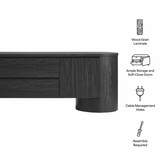 Grounded in modern design with a bold silhouette, the Duval Oval TV Stand brings both character and storage to your space. Measuring 71 inches long, it features a soft, rounded profile and a smooth matte finish that gives it a sculptural look in any living room TV stand setup. Two spacious drawers sit between flanking cupboards with soft-close hinges, offering generous storage for media, remotes, and more. Pairing beautifully with wall mount TVs, the Duval TV entertainment center features three cut-out holes with covers along the back for easy cable management, keeping wires tucked neatly out of sight. Its circular plinth-style bases add stability and flow seamlessly into the curved silhouette, giving this mid-century media cabinet its distinctive presence. With a clean silhouette and hidden storage, Duval is a striking piece and fits well in minimalist or modern organic homes. Weight capacity: 200 lbs.