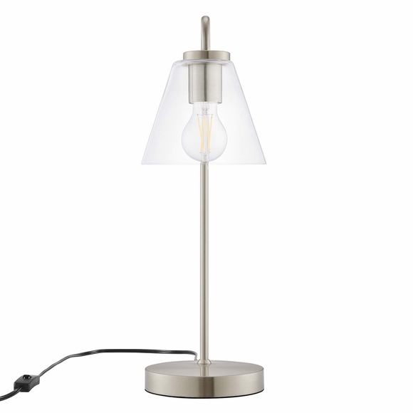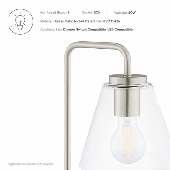 The Element Glass Table Lamp accentuates your home decor in the living room, bedroom, office, or study room with its distinctive mid-century modern aesthetic. This side table lamp brings farmhouse appeal to mid-century modern, contemporary, rustic, or eclectic decors, boasting a classic transparent glass cone shade. An ideal desk lamp for the home office, Element is solidly constructed with a bent-pipe arm and a round iron base. This dimmable coffee table lamp is equipped with a black power cord and a convenient on/off switch. Requires 1 E26 60W max bulb or LED equivalent (not included). Compatible with dimmer switches (not included). Assembly required. Clean with a soft, damp cloth.