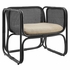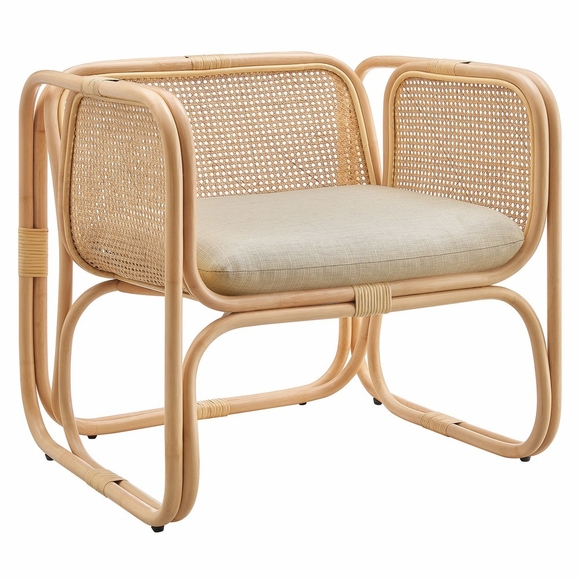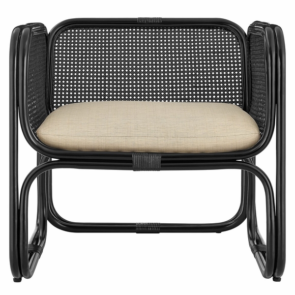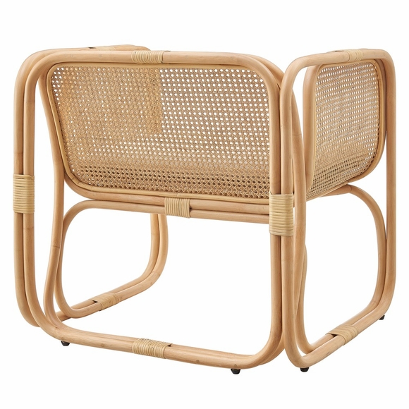 Shaped with a playful mix of curves and angles, the Ellis rattan lounge chair brings a fresh, laid-back energy to living rooms, bedrooms, or sun-filled nooks. Its continuous frame flows smoothly from backrest to base, wrapping around open-weave panels that keep the silhouette light and airy from every angle. A padded seat cushion with a machine washable cover adds comfort without fuss, while the low-slung design makes it a natural pick for reading, relaxing, or unwinding in a quiet corner. Built for everyday use, this rattan accent chair comes fully assembled with non-marking foot caps, making it just as suitable for covered patios or garden rooms. Product Note: Due to the natural qualities of rattan, slight variations in color and pattern are to be expected, adding to each piece's unique character.