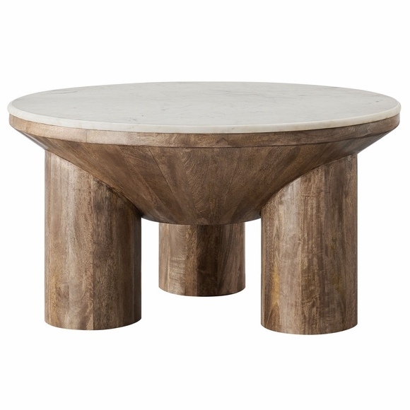 Elevate your living room with the Ellison Round Mango Wood Coffee Table, a stunning fusion of natural materials and sculptural design. Topped with luxurious genuine marble, this 33-inch coffee table adds timeless elegance to your space while offering a durable surface for decor, drinks, or everyday essentials. The base of this circular coffee table, crafted from solid mango wood, features a bold drum silhouette supported by three cylindrical legs, blending natural warmth with modern sophistication. Perfect for contemporary and mid-century modern interiors, the Ellison Wood and Marble Coffee Table is a true statement piece that complements any living space. Equipped with felt floor pads to protect your flooring, this drum coffee table is as practical as it is stylish. Best of all, it arrives fully assembled, ready to bring effortless charm to your home. Accent Table Weight Capacity: 91 lbs.