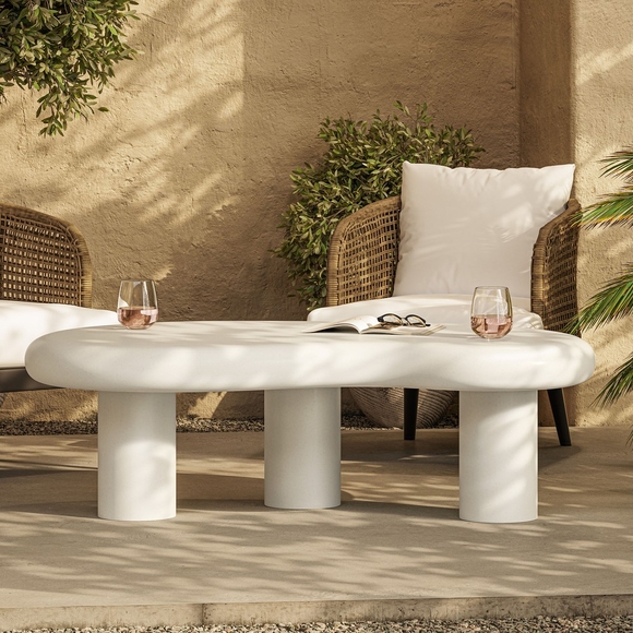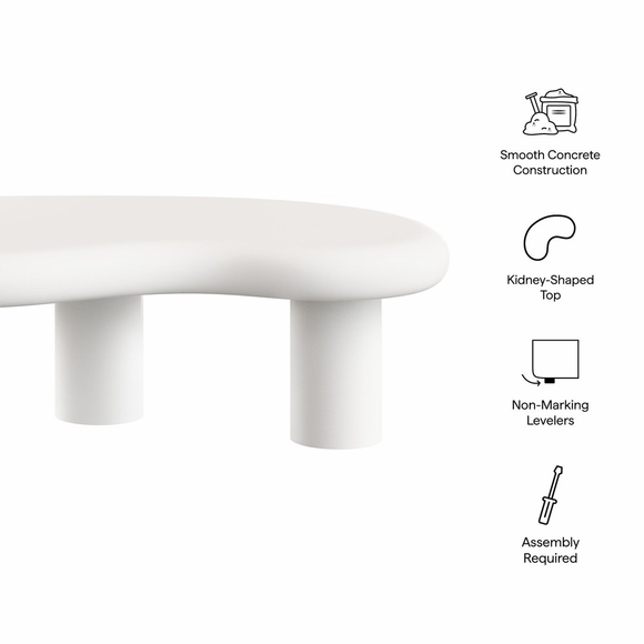 Add a touch of modern artistry to any space with the Elowen Coffee Table. Designed with a soft kidney-shaped top and sturdy pedestal legs, this concrete coffee table has a smooth finish and a clean, sculptural look that feels right at home indoors or outdoors. Style it as a living room centerpiece in front of a sofa, use it as an outdoor coffee table on the patio, or set it poolside as a low table for drinks, books, and sun essentials. Built from durable concrete, Elowen feels solid and steady, while non-marking levelers help protect floors and keep it balanced on uneven surfaces. Assembly required. Weight Capacity: 230 lbs.