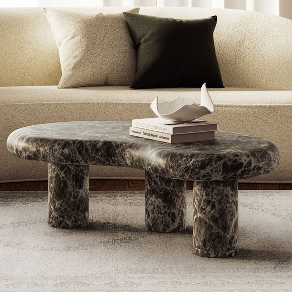 Add a touch of modern artistry to any space with the Elowen Faux Marble Coffee Table. Designed with a soft kidney-shaped top and sturdy pedestal legs, this faux marble coffee table has a smooth finish and a clean, sculptural look that feels right at home indoors or outdoors. Style it as a living room centerpiece in front of a sofa, use it as an outdoor coffee table on the patio, or set it poolside as a low table for drinks, books, and sun essentials. Made from durable concrete with a faux Emperador marble finish, Elowen feels solid and steady, while non-marking levelers help protect floors and keep it balanced on uneven surfaces. Assembly required. Weight Capacity: 230 lbs.