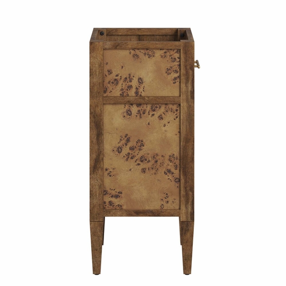 Discover the epitome of organic aesthetics and practicality with the Elysian 18" Burl Wood Bathroom Vanity Cabinet. Each vanity cabinet is uniquely crafted from exquisite mango wood, further adorned with a rich burl wood veneer, radiating a distinctive charm and character. A fixed top drawer and tapered wood legs add to the sleek design, while the spacious shelving-complete with a convenient plumbing cutout-offers ample storage space for all your bathroom essentials. While assembly is required, this vanity includes easy-to-follow assembly instructions. Sink basin and fixtures not included.