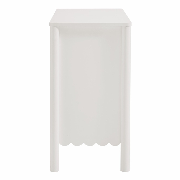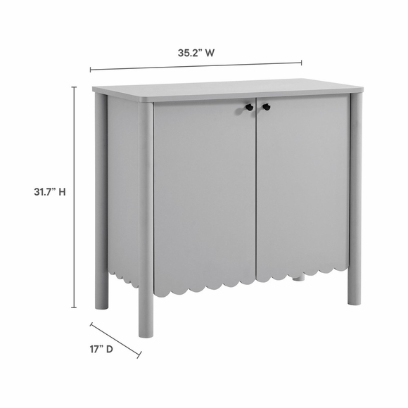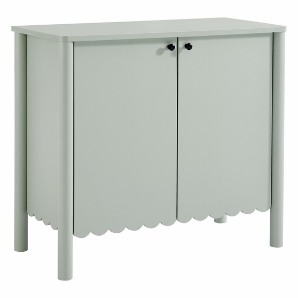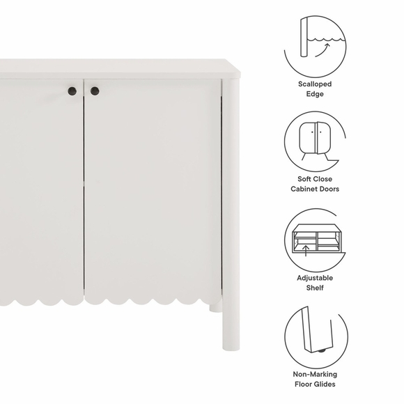 An elegant blend of subtle curves and practical storage, the Emmeline 2-Door Wavy Sideboard Cabinet adds a touch of artistic flair to any room. Its standout feature-a scalloped bottom edge-creates a soft, flowing silhouette that enhances the modern simplicity of the design. Behind its two soft-close doors, an adjustable shelf provides flexible storage space, ideal for organizing dining essentials, decor, or media accessories. Crafted with a sturdy frame and finished in smooth laminate, this farmhouse side cabinet is as functional as it is stylish. The round door knobs and non-marking glides add to its refined appearance, while ensuring your floors remain protected. Whether serving as a modern sideboard, accent cabinet, or entryway console with storage, Emmeline brings a contemporary, polished look to hallways, dining rooms, or living spaces. Assembly required.