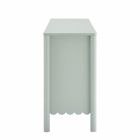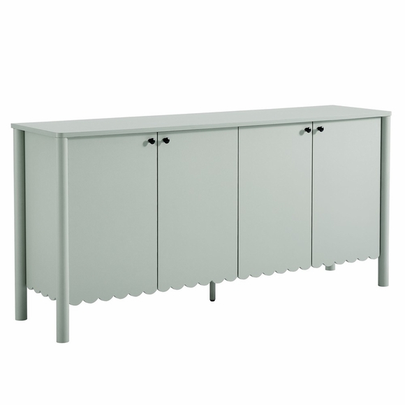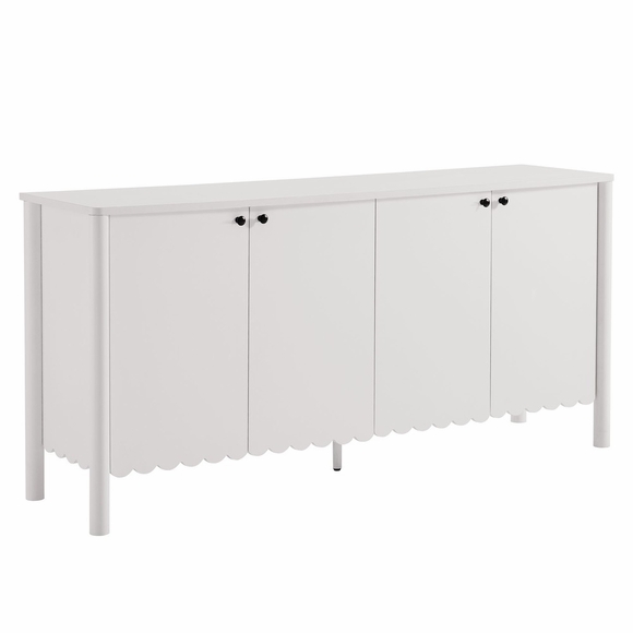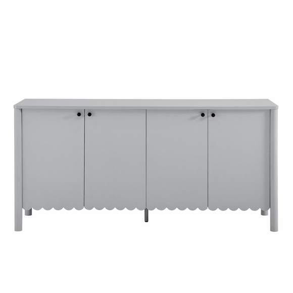 An elegant blend of subtle curves and practical storage, the Emmeline 4-Door Wavy Sideboard Cabinet adds a touch of artistic flair to any room. Its standout feature-a scalloped bottom edge-creates a soft, flowing silhouette that enhances the modern simplicity of the design. Behind its four soft-close doors, adjustable shelves provide flexible storage space, ideal for organizing dining essentials, decor, or media accessories. Crafted with a sturdy frame and finished in smooth laminate, this wide farmhouse sideboard is as functional as it is stylish. The round door knobs and non-marking glides add to its refined appearance, while ensuring your floors remain protected. Whether serving as a modern sideboard, accent cabinet, or entryway console with storage, Emmeline brings a contemporary, polished look to hallways, dining rooms, or living spaces. Assembly required.
