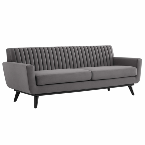 Gently sloping curves and plush seat cushion create a favorite lounging spot. Whether relaxing after a long day at work, settling in with coffee and brunch, or entering a spirited discussion with friends, the Engage Sofa is a welcome presence in your home. Channel tufting creates eye-catching appeal, adding depth that brings your sitting decor to center stage. The black painted rubberwood legs and frame offer a solid base for the stain-resistant performance velvet upholstery.