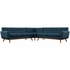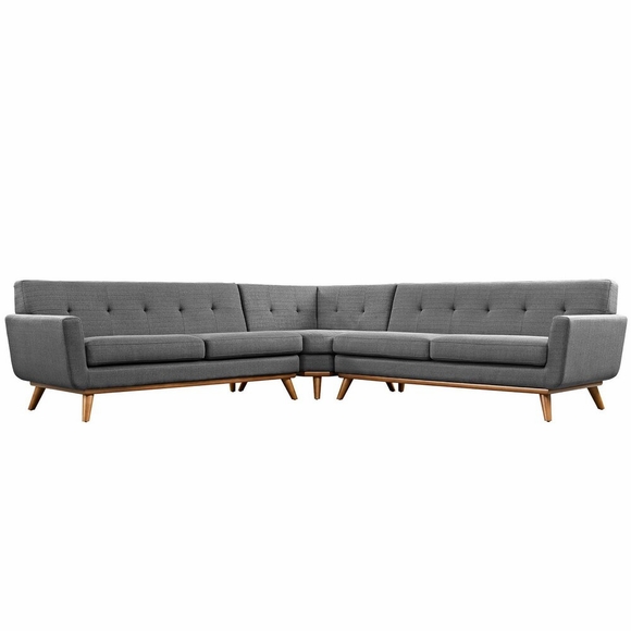 Gently sloping curves and large dual cushions create a favorite lounging spot. Whether relaxing after a long day at work, settling in with coffee and brunch, or entering a spirited discussion with friends, the Engage Sectional Sofa is a welcome presence in your home. Buttons create eye-catching appeal, adding depth that brings your sitting decor to center stage. Four rubberwood legs and frame supply a solid base to the comfortable upholstered material.