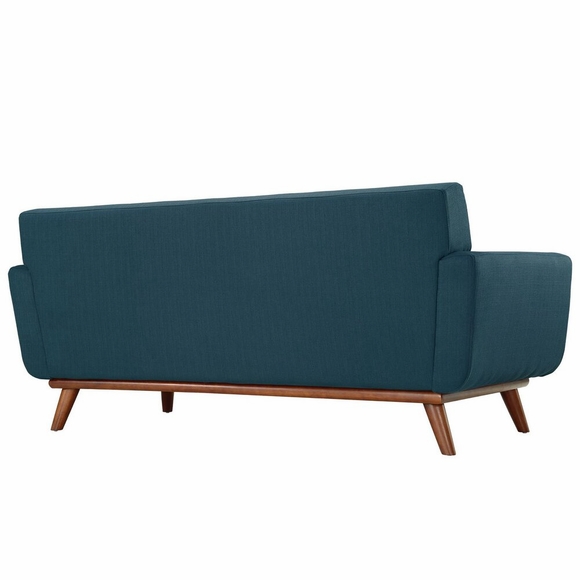 Gently sloping curves and large dual cushions create a favorite lounging spot. Whether relaxing after a long day at work, settling in with coffee and brunch, or entering a spirited discussion with friends, the Engage loveseat is a welcome presence in your home. Five tufted buttons create eye-catching appeal, adding depth that brings your sitting decor to center stage. Four cherry color rubberwood legs and frame supply a solid base to the comfortable upholstered material.