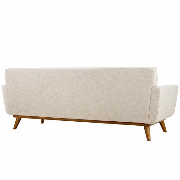 Gently sloping curves and plush seat cushion create a favorite lounging spot. Whether relaxing after a long day at work, settling in with coffee and brunch, or entering a spirited discussion with friends, the Engage Sofa is a welcome presence in your home. Three tufted buttons create eye-catching appeal, adding depth that brings your sitting decor to center stage. Four cherry color rubberwood legs and frame supply a solid base to the comfortable upholstered material.