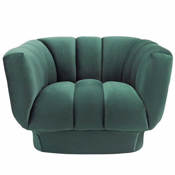 Energize your living room decor with Entertain. Sit deeply in tactile luxury with vertical channel tufting that creates visual depth and a magnificent waterfall effect that spans the length of this vintage glamour armchair. Entertain features plush dense foam padding with soft, stain-resistant performance velvet upholstery for a luxurious seating experience that delivers premium comfort. Entertain can support up to 300 lbs and rests securely on a rimmed base covered in matching velvet. Introduce this cozy, extra wide retro-modern centerpiece to your living room or lounge area.