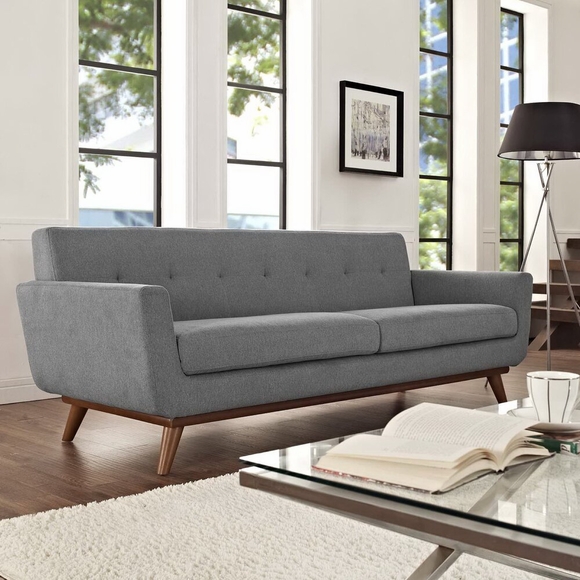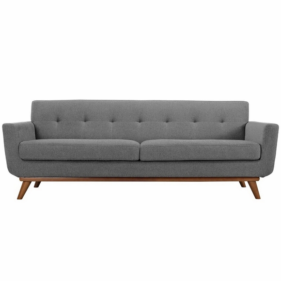 Gently sloping curves and plush seat cushion create a favorite lounging spot. Whether relaxing after a long day at work, settling in with coffee and brunch, or entering a spirited discussion with friends, the Engage Sofa is a welcome presence in your home. Three tufted buttons create eye-catching appeal, adding depth that brings your sitting decor to center stage. Four cherry color rubberwood legs and frame supply a solid base to the comfortable upholstered material.