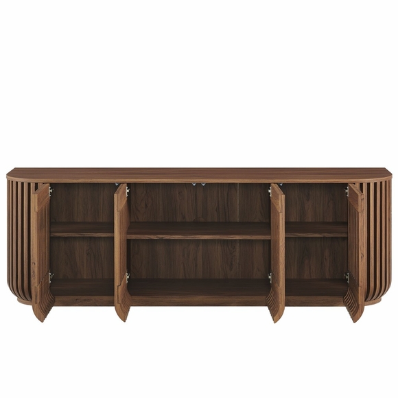 Elevate your interior with the Fortitude 75" Curved Sideboard, a bold blend of texture, function, and modern style. Featuring an elongated silhouette with rounded edges and vertical timber-style fluted detailing, this large sideboard makes a sculptural statement in any living room, dining area, or office. Crafted from MDF and particleboard with a wood grain finish, Fortitude is both sturdy and visually refined. Four push-to-open doors reveal spacious storage compartments with an adjustable center shelf, offering versatile storage for dinnerware, electronics, books, or barware. A discreet cable management hole allows for seamless media console use, while non-marking foot caps protect flooring. Whether used as a buffet, large stand for wall mounted TVs, or storage credenza, Fortitude brings modern form and everyday function into perfect balance. Assembly required. Top Panel Weight Capacity: 254 lbs.