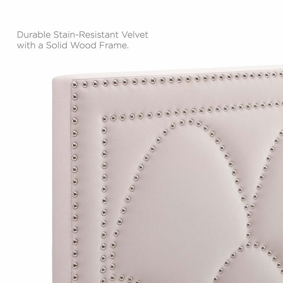 Bring modern elegance and glam deco style to your master bedroom or guest bedroom with the Greta Performance Velvet King/California King Headboard. Rich in velvety texture and vintage charm, this king / Cali king size headboard features classic nailhead detail that forms a beautiful scale pattern and double trim. Upholstered in stain-resistant performance velvet, this foam padded headboard offers supportive comfort while sitting up in bed relaxing, reading, or watching TV. A beautiful backdrop for a variety of bedding styles, this adjustable headboard fits king or California king bed frames with its three mounting positions. Assembly required.