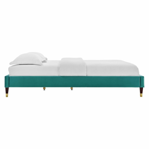 Bring glam deco style and luxurious sleep to your guest bedroom or teenager's bedroom with the Harlow Performance Velvet Full Bed Frame. Resting atop wood legs with gold metal sleeves, the side rails of this platform bed are covered in soft, stain-resistant performance velvet offering rich texture to the simple design. This full size bed frame is a sturdy mattress foundation for memory foam, innerspring, latex, and hybrid mattresses. with supporting legs and a reinforced center beam, this upholstered bed is complete with a poplar wood slat support system that offers lasting stability. Compatible with a variety of full headboard designs, this full platform bed also makes a statement as a stand-alone piece. Mattress not included. Assembly required. Full Bed Frame Weight Capacity: 800 lbs.