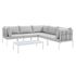 Engage life with Harmony. Enjoy casual conversation under the open sky with an all-weather waterproof furniture set that delivers an exceptional outdoor porch, patio, balcony or garden experience. An exceptional modern furniture set that exceeds expectations, Harmony comes with long-lasting machine washable Sunbrella® cushions, synthetic rattan seat back weave, square powder coated aluminum bases, tempered glass top tables, and non-marking foot caps. A sectional that arranges according to the spontaneous needs of your guests, set your sights on open and inspired moments with the Harmony Outdoor Patio Collection. Set Includes: 3 Corner Chairs, 2 Armless Chairs, 1 Coffee Table