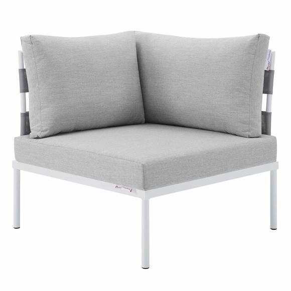 Engage life with Harmony. Enjoy casual conversation under the open sky with an all-weather waterproof furniture set that delivers an exceptional outdoor porch, patio, balcony or garden experience. An exceptional modern furniture set that exceeds expectations, Harmony comes with long-lasting machine washable Sunbrella® fabric cushions, silk polyester seat back weave, square powder coated aluminum bases, tempered glass top tables, and non-marking foot caps. A sectional that arranges according to the spontaneous needs of your guests, set your sights on open and inspired moments with the Harmony Outdoor Patio Collection. Set Includes: 2 Corner Chairs, 1 Armless Chair, 1 Ottoman, 1 Armchair, 1 Side Table