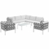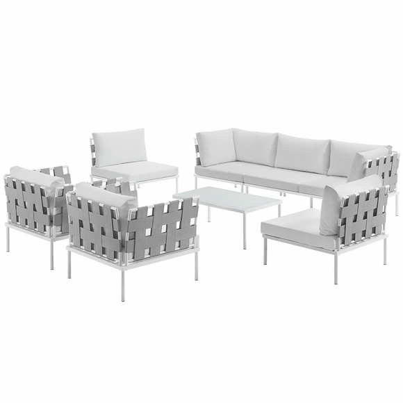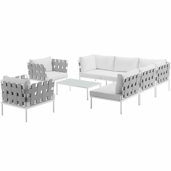 Engage life with Harmony Outdoor Patio Sectional Sofa Furniture Set. Enjoy casual conversation under the open sky with an all-weather waterproof furniture set that delivers an exceptional outdoor porch, patio, balcony or garden experience. An exceptional modern patio furniture set that exceeds expectations, this Harmony Outdoor Sectional set comes with long-lasting machine washable cushions, silk polyester seat back weave, square powder coated aluminum bases, tempered glass top tables, and non-marking foot caps. A sectional sofa that arranges according to the spontaneous needs of your guests, set your sights on open and inspired moments with the Harmony Outdoor Patio Collection.