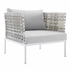 Engage life with Harmony Outdoor Patio Armchair. Enjoy casual conversation under the open sky with an all-weather waterproof outdoor chair from a versatile furniture set that delivers an exceptional outdoor porch, patio, balcony or garden experience. An exceptional modern outdoor furniture set that exceeds expectations, Harmony Patio Armchair comes with synthetic rattan seat back weave, square powder coated aluminum bases, Sunbrella® cushions, and non-marking foot caps. An outside chair that arranges according to the spontaneous needs of your guests, set your sights on open and inspired moments with the Harmony Outdoor Patio Collection.