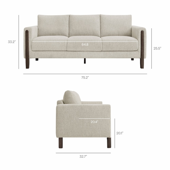 Settle into sculptural comfort with the Hawken Boucle Fabric Upholstered Sofa. Designed with bold curves and oversized proportions, this three-seater couch offers a wide, inviting seat and gently sloped armrests for a cozy reading or relaxation experience. Upholstered in soft brushed boucle fabric, Hawken adds depth and visual warmth to any space-from living room to apartment to office lounge. The sturdy solid wood legs complement the textured boucle upholstery with natural warmth and mid-century charm. With a supportive foam-padded seat, plush back cushions, and zigzag spring suspension, this modern sofa delivers everyday comfort with timeless style. Assembly required. Weight Capacity: 500 lbs.
