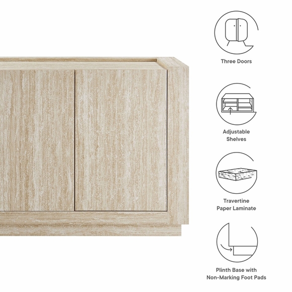 Bring a fresh look to your home with the Hollis Sideboard, a 59-inch cabinet designed to balance functionality and style. Featuring a sleek travertine laminate finish, this sideboard with 3 doors provides ample storage for all your needs, making it a stunning cabinet storage sideboard for your living room or entryway or even a tall TV cabinet for your anchored or wall-mounted TV. The spacious interior includes adjustable shelves, allowing you to customize the storage to suit dinnerware, media essentials, decor, and more. The large storage cabinet structure of this faux travertine sideboard naturally fits into any setting, offering both style and practical storage. Its plinth base and non-marking foot pads ensure stability and floor protection, offering a beautiful storage credenza that compliments your home's decor. Whether you're looking for a chic sideboard with storage or a dining room buffet cabinet, Hollis is the storage solution you need every day to keep your space tidy and organized. Top Panel Weight Capacity: 271 lbs, Shelves: 44 lbs.