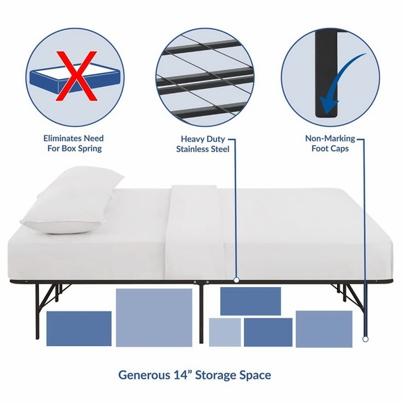 Sleep better with the Horizon Metal Bed Frame. Horizon is made with a reinforced stainless steel metal base for long-term comfort and uses with a generous 14 inches of space underneath to store hobby collections or seasonable clothing bins. Horizon comfortably supports up to 1300 lbs, easily folds away when not in use, and eliminates the need for a box spring with its heavy duty platform frame construction. Complete with non-marking foot caps to keep your carpets and floor safe, Horizon is a low profile modern bed frame that supports the standard mattress types on the market: memory foam, spring, latex or hybrids. Available in twin, full, or queen, Horizon reduces annoying squeaks and unpleasant bending or buckling, while transforming your home decor with a selection of stylish color options. Designed to provide lasting support for years to come, Horizon prevents saggy mattresses and increases the mattress lifespan while delivering a better-made bed frame solution for your home. No tools required. Mattress not included.