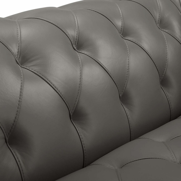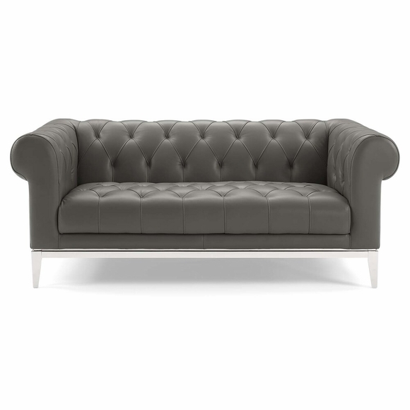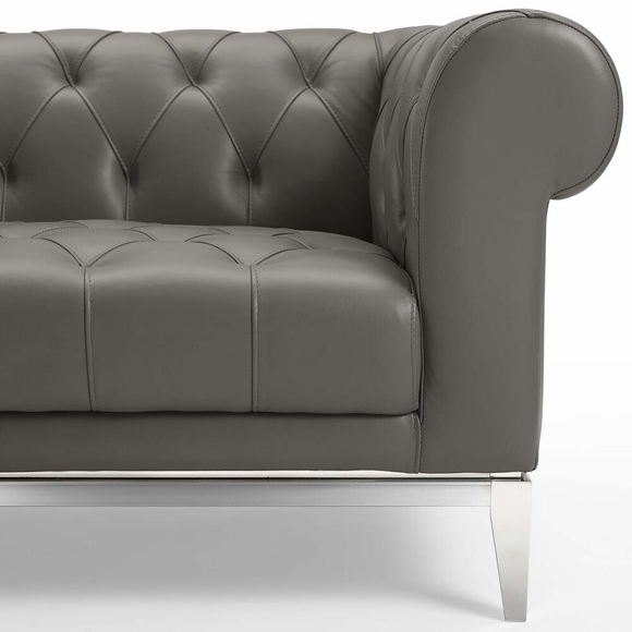 Rollick in the luxurious expanse of the Idyll Leather Chesterfield Loveseat. Featuring soft leather upholstery, rolled arms and tufted button accent details, dense foam padding, and a sinuous spring system for responsive support, Idyll creates a lushly comfortable seating environment that invites lingering conversations and leisure time. This 70-inch loveseat comes with elegant leather upholstery in this designer loveseat sure to become the focal point of your home. Supported by a sturdy polished stainless steel frame, enhance your living room decor with the timeless look of this vintage loveseat. Weight Capacity: 600 lbs.