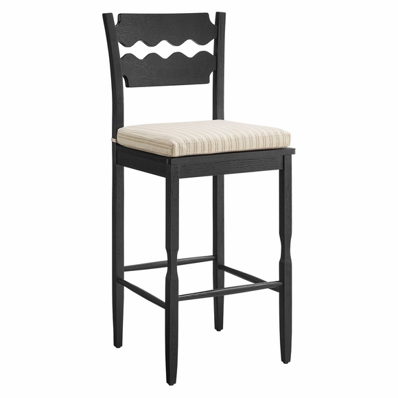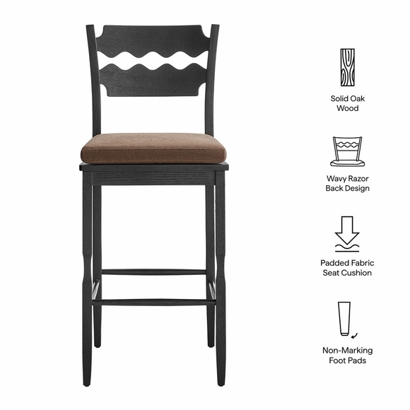 The Jax Single Oak Wood Bar Stool brings a bold, vintage-inspired profile to your space with its unique wavy razor-back. Crafted from solid oak, this wood bar stool stands comfortably at a 29 inch seat height, with the distinct back design giving a quiet nod to vintage bistro barstools. Featuring a fabric seat cushion that ties onto the frame to stay in place, this barstool also rests on a four-sided stretcher base so it feels sturdy and comfortable for everyday use. Jax is a natural fit as a bar height stool for a home bar or as an extra perch around the house. Arriving fully assembled, it comes with non-marking foot pads to help protect your floors. Weight Capacity: 300lbs.