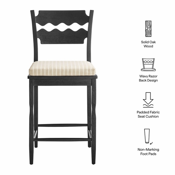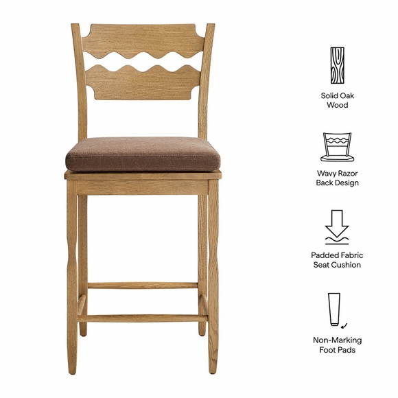 The Jax Single Oak Wood Counter Stool brings a bold, vintage-inspired profile to your space with its unique wavy razor-back. Crafted from solid oak, this wood counter stool sits comfortably a 25 inch seat height, with the distinct back design giving a quiet nod to classic cafe stools. Featuring a fabric seat cushion that ties onto the frame to stay in place, this counter stool also rests on a four-sided stretcher base so it feels sturdy and comfortable for everyday use. Jax is a natural fit as a counter stool for kitchen island seating, a counter chair at a breakfast bar, or extra perch around the home. Arriving fully assembled, it comes with non-marking foot pads to help protect your floors. Weight Capacity: 300lbs.