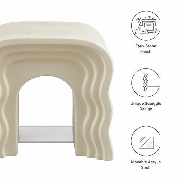 Bring an artistic flair to your living space with the Jorin Squiggle Side Table, an abstract and functional statement piece. Featuring a wavy, sculpted design, this faux stone table is crafted from solid magnesium oxide molding, lending it a distressed finish that enhances its vintage vibe. Perfect for small spaces, this funky end table features a movable acrylic shelf that slides in and out, offering a stylish solution for displaying plants, books, or decorative accents. Whether placed in the living room as a small accent table or used as a bedroom nightstand, the Jorin Retro Side Table offers versatility with a modern edge. Arriving fully assembled and ready to use, Jorin comes with non-marking foot pads for floor protection. Add a touch of character with this curved boho end table that effortlessly blends into small spaces while standing out with its unique design.