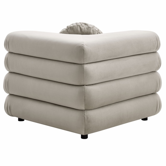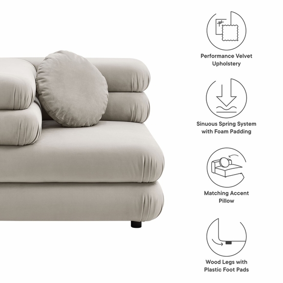Reimagine your living space with the Jubilee Performance Velvet Corner Chair, a striking blend of retro flair and modern comfort. With its sleek design, the Jubilee Accent Lounge Chair provides a spacious seating experience without compromising on style. Designed as part of the Jubilee sectional sofa set, this corner seat works as a stylish accent chair or attaches to other Jubilee pieces with an alligator clamp couch connector, making it easy to add additional seating down the line. Draped in stain-resistant performance velvet fabric, this comfy living room chair exudes luxury with its dense foam padding and intricate detailing. The thick, gently tufted cushions are arranged in layers, creating a plush, stacked appearance with rounded edges for a cozy feel. The included 18" round pillow not only adds to its classic charm but also enhances the modular chair's comfort and style, making it an inviting spot to relax. With premium zigzag spring pocket coils for robust support and comfort, Jubilee is the perfect oversized living room chair or comfy bedroom chair for hours of lounging. Equipped with plastic foot pads to protect your floors, this corner sofa chair with round pillow is the retro accent chair your modern decor needs. Assembly Required. Weight Capacity: 331 lbs.