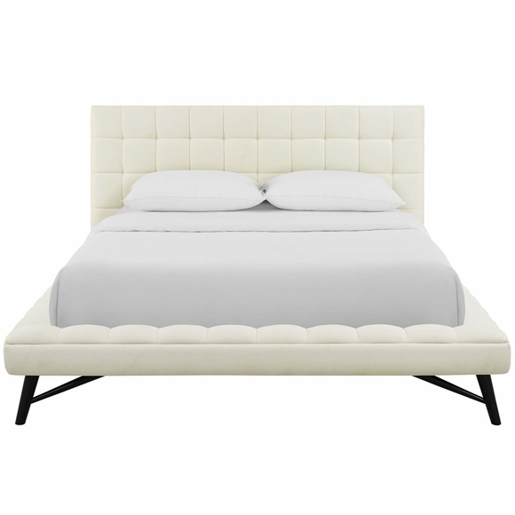 Anchor your bedroom with the charm and sophistication of the Julia Queen Platform Bed. Julia's sturdy, low-profile plywood frame sits atop four splayed and tapered wood legs for an open expanse of restful luxury. Mid-century elegance sweeps into your master suite or guest room decor with Julia's biscuit tufting and polyester fabric upholstery that spans both headboard and frame. Julia's soft and durable fabric upholstery covers dense foam padding creating the perfect recline for resting, conversing or reading in bed. Julia comes with a wood slat support system that eliminates the need for a box spring and accommodates memory foam, spring, latex, and hybrid mattresses. This sturdy queen bed frame with a queen size headboard provides support for up to 800 lbs.