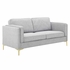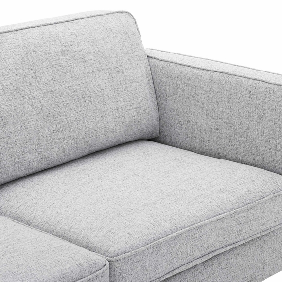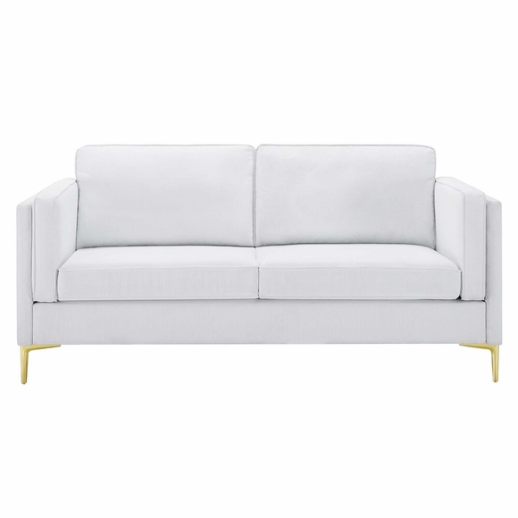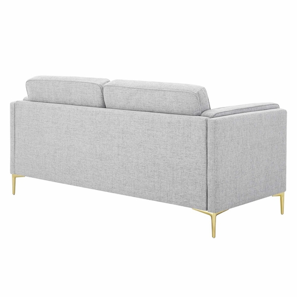 Invigorate your living space with rich tactiles and retro modern charm with the Kaiya Fabric Sofa. Putting a contemporary twist on a classic mid-century modern design, this living room sofa features subtle French piping detail, a tailored profile, and gold metal accents. Covered in soft polyester fabric, this upholstered sofa is padded with dense foam and complete with a sinuous spring support system to offer a premium seating experience. Resting on gold metal legs with non-marking foot pins, this fabric sofa features a solid wood construction for lasting durability. Assembly required. Sofa Weight Capacity: 900 lbs.