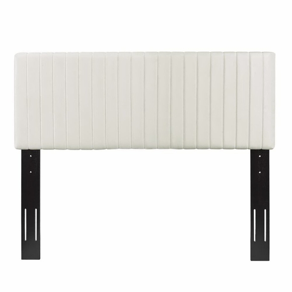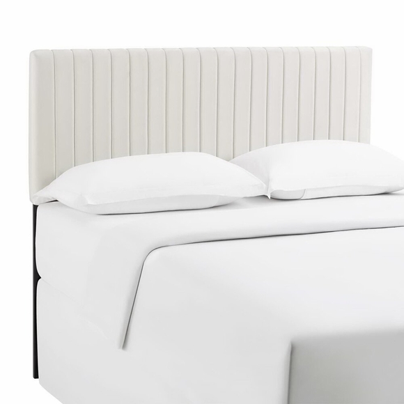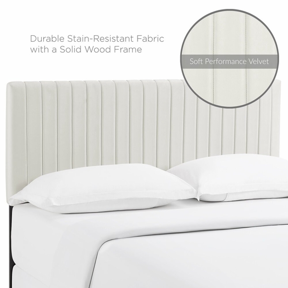 Refresh your master bedroom with the Keira King/California King Headboard. This elegant king headboard makes a luxe statement with its channel tufting, velvet texture, and chic squared profile. Boasting a modern design with timeless appeal, this upholstered headboard is covered in soft performance velvet made of stain-resistant polyester and features a solid wood and particleboard construction that's durable and long-lasting. Lean back and relax while reading or watching TV in bed with the dense foam padding on this upholstered king headboard. Fits king and California king size beds.