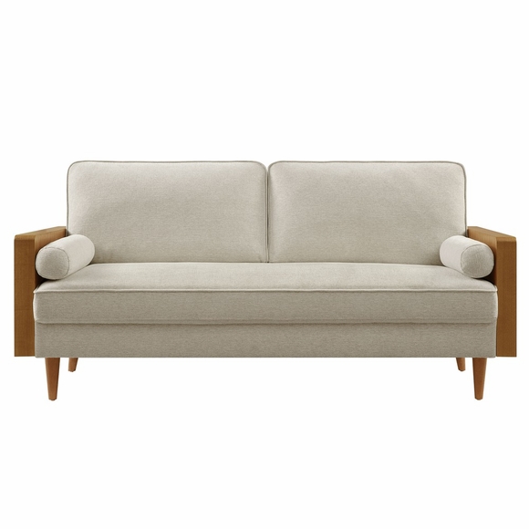 A statement piece for the discerning home, the Kellan Upholstered Sofa combines style and comfort in a sophisticated, updated design. This deep seat sofa is covered in a soft, heathered weave fabric, offering a textured look that adds depth and warmth to any room. The wood grain armrests, crafted from rich veneer, complement its mid-century modern appeal. Supported by tapered wood legs with non-marking floor glides, this 3-seater sofa provides both practicality and elegance, protecting your floors while enhancing the ambiance of your living room, bedroom, office, or waiting area. With high-density foam padding and zigzag spring support, this comfortable couch delivers a premium seating experience, while the down feather blend of the back and bolster cushions adds extra plushness. Whether as a mid century office couch or a soft sofa for relaxing, Kellan is a versatile piece that will elevate your home with its refined style and inviting comfort. Assembly required. 3 Seater Sofa Weight Capacity: 893 lbs.