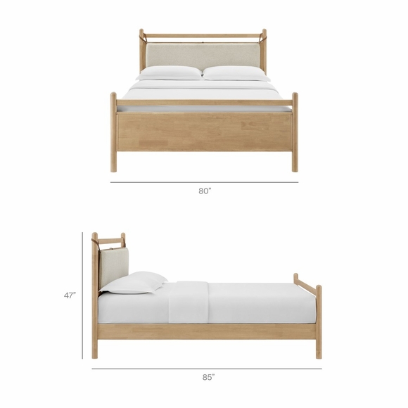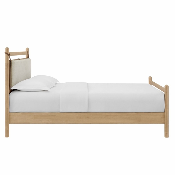 The Leni King Platform Bed has a clean, relaxed profile with gently rounded lines. Crafted from solid rubberwood, this king size bed frame features sturdy wooden slats that support your mattress without the need for a box spring. At the head of the bed, a heathered fabric pillow hangs from faux leather straps to create an upholstered headboard that adds padding and a comfortable spot for reading or evening wind-downs. The simple footboard and rounded posts keep the silhouette easy to style, pairing well with a range of bedding and decor from primary bedrooms to master suites. This solid wood bed frame with headboard offers stable support night after night with an 800 lb weight capacity.