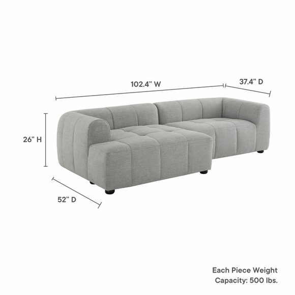 Step into the world of refined relaxation with the Liana Modular Sectional Sofa, a stylish centerpiece that combines comfort with a chic, casual aesthetic. Embodying a retro-modern look, the Liana Sofa Couch features dense foam padding encased in fabric upholstery. It includes a left chaise and right chair, making it ideal for stretching out and relaxing after a long day. Enhancing the modular sofa's allure, subtly tufted seats blend with a neatly stitched grid pattern that extends into the gently curved armrests and backrests, imparting a touch of geometric flair. Its low profile and deep seating are thoughtfully designed to cater to contemporary aesthetics while providing ample space to relax. Durably constructed and supported by solid wood bun feet with non-marking floor glides, the Liana Left-Facing Sectional Couch stands strong, ready to support countless lounge times. Perfectly at home in a chic modern living room or a mid-century modern lounge, the Liana Left-Facing Chaise Couch beckons you to unwind in style. Weight Capacity of Each Seat: 500 lbs.