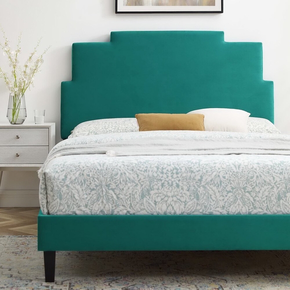 Elevate the style in a guest bedroom or teenager's bedroom with the Lindsey Performance Velvet Full Platform Bed. The padded headboard of this full size bed features luxe texture, clean lines, and escalating silhouette. Rich in glam deco style and vintage modern elegance, this upholstered bed is covered in stain-resistant performance velvet and is a sturdy mattress foundation for memory foam, innerspring, latex, and hybrid mattresses. Eliminating the need for a box spring, the MDF frame of this full platform bed is complete with a wood slat support system crafted with poplar for lasting durability and support. This slatted bed frame rests on black wood legs with non-marking foot caps and includes a reinforced center beam with two support legs for enhanced stability. Assembly required. Full Bed Weight Capacity: 800 lbs.