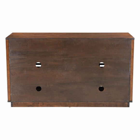 Scandinavian in design the Linea series features narrow slim strips of Solid Fir Wood, creating a Modern airy design finished in a rich walnut finish. The credenza features two front opening doors, two interior drawers with two adjustable shelves, and holes for TV components accessibility.