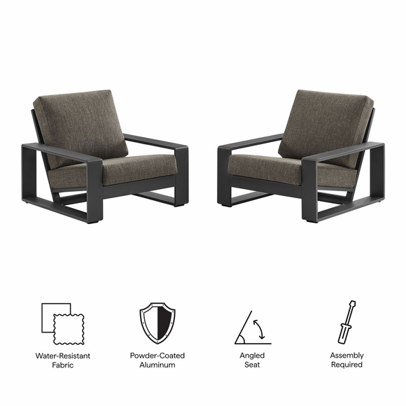 Unwind in sculptural sophistication with the Lirienne Outdoor Patio Armchair Set. Designed for modern relaxation, these two matching outdoor chairs showcase sleek, rectangular frames crafted from durable powder-coated aluminum, offering both resilience and style. The deep, angled seats and plush foam cushions invite you to sink into comfort, while the fabric upholstery is stain-resistant, weather-resistant, and easy to maintain with removable, washable covers. Perfect for lounging on a sun-drenched deck, cozy balcony, or shaded patio, this set of two aluminum patio chairs brings an air of refined ease to any alfresco setting. Weight Capacity (each): 300 lbs.
