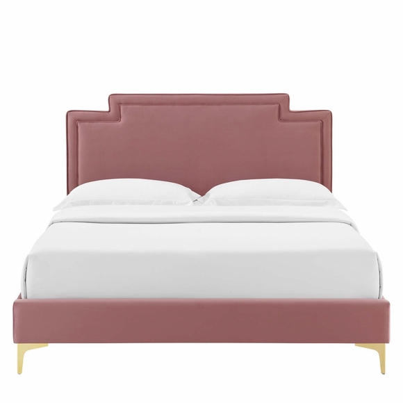 Cultivate an aura of refinement in your master bedroom or guest room decor with the sleek design of the Liva Performance Velvet King Bed. The modern upholstered headboard features delicate French piping and is an alluring focal point sturdily constructed on solid plywood and MDF frame. Complementing mid-century modern, contemporary, or eclectic decors, the Liva Upholstered King Bed brings an essence of restfulness, featuring stain-resistant performance velvet and dense foam padding. This king platform bed boasts a well-crafted MDF bed frame providing a sturdy foundation for memory foam, innerspring, latex, and hybrid mattresses. The Liva Upholstered Platform Bed features a durable poplar wood slat support system with a reinforced center beam and two support legs, eliminating the need for a box spring. The slatted bed frame rests on gold metal legs with non-marking foot caps. Assembly required. Weight Capacity: 800 lbs.