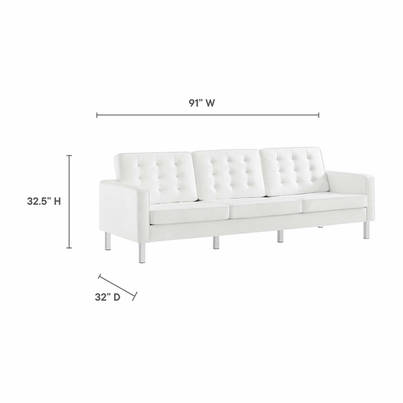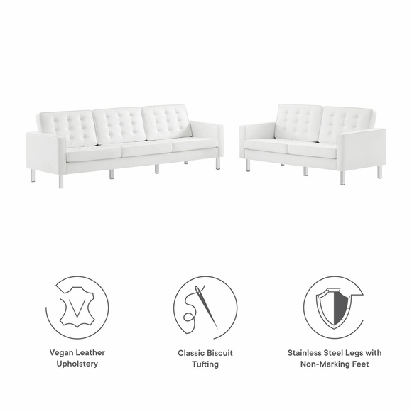 Revolutionize your living room furniture with the iconic Loft Vegan Leather Furniture Set. Adding visual depth to your living room or lounge space, Loft features soft and durable vegan leather upholstery accented with classic biscuit tufting. This modern living room furniture set showcases a captivating linear design, tubular stainless steel legs, and non-marking foot caps that protect flooring. Inspired by the richness of mid-century modern style, this stylish furniture set is an ideal choice for living rooms, office reception areas, and lounge spaces. Assembly required. Set Includes: 1 Loveseat, 1 Sofa