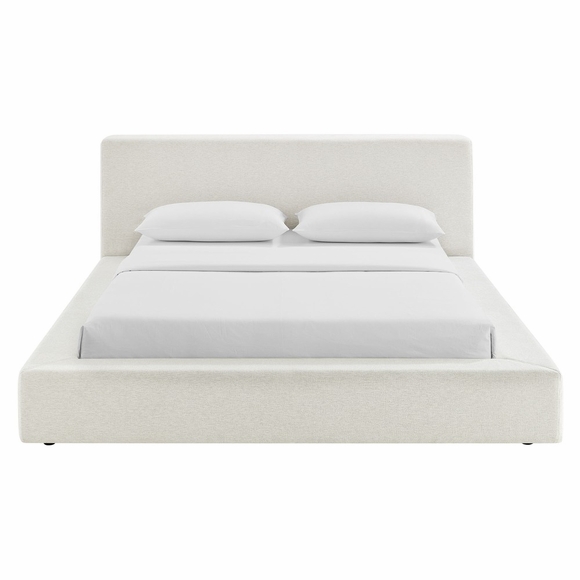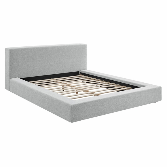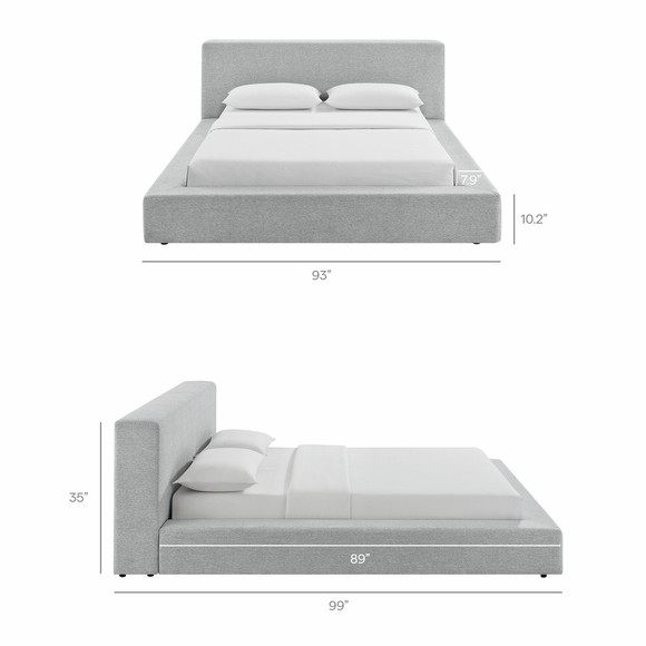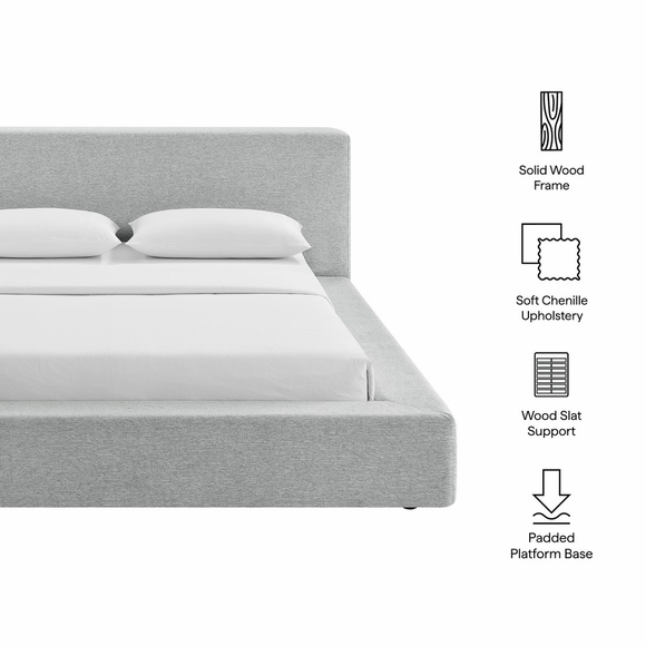 Set a calm foundation for the bedroom with Luma, a soft upholstered platform bed. Sized for a king mattress, Luma pairs a tall, padded headboard with bumper-style padded sides and foot, all wrapped in soft chenille to form one continuous frame around the mattress. The floor-hugging profile creates a modern, built-in look that feels cozy and relaxed in primary rooms or guest spaces. Beneath the upholstery, a sturdy wood frame and rounded corners keep the profile smooth from every angle. The fabric cover is spot cleanable, as needed. Inside, evenly spaced wood slats support the mattress without a box spring, keeping the fabric bed frame looking clean while still feeling solid and comfortable. Assembly required.