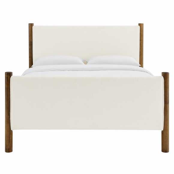 A perfect blend of cozy texture and craftsmanship, the Maven Full Size Platform Bed serves as a stylish focal point in any bedroom. The upholstered headboard and footboard, padded and covered in soft boucle fabric, create a warm and inviting atmosphere, framed by solid wood posts for a touch of timeless elegance. Designed with wooden slats that support your mattress while promoting airflow, this platform bed eliminates the need for a box spring. Ideal for guest rooms, compact spaces, or as a chic centerpiece in a teenager's bedroom, the Maven Boucle Full Bed combines modern aesthetics with practical functionality for those seeking both comfort and durability. Weight Capacity: 794 lbs.