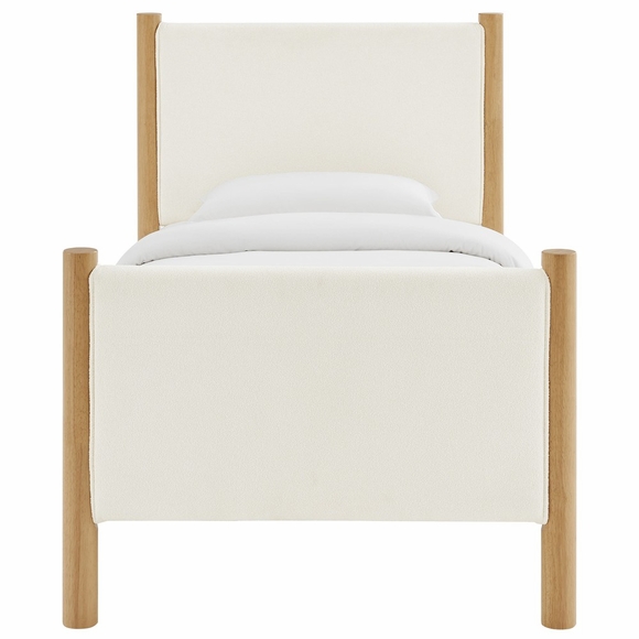 A perfect blend of cozy texture and craftsmanship, the Maven Twin Size Platform Bed brings a stylish focal point to any bedroom. The upholstered headboard and footboard, padded and covered in soft boucle fabric, provide a warm, inviting backdrop framed by robust solid wood posts for a touch of timeless elegance. Designed with wooden slats that support your mattress while promoting airflow, this platform bed eliminates the need for a box spring. Ideal for compact spaces, kids' rooms, or guest accommodations, the Maven Boucle Twin Bed combines a modern look with practical functionality, making it an excellent choice for those seeking both comfort and durability. Weight Capacity: 794 lbs.