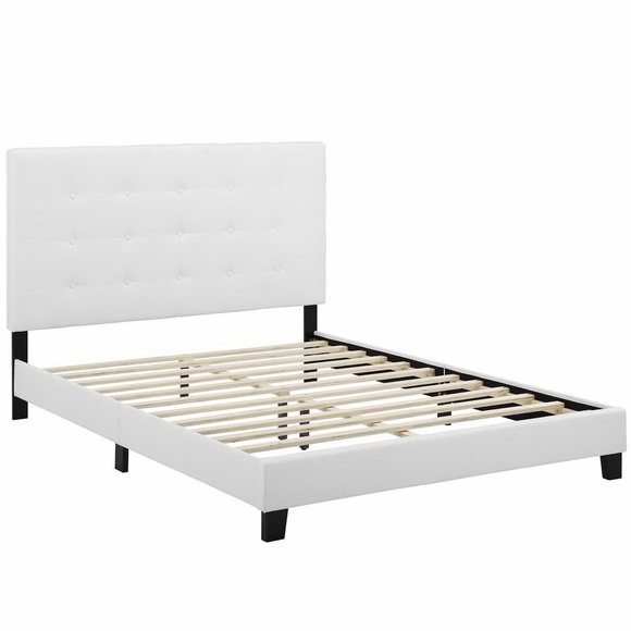 Clean lines, a straightforward profile, and classic button tufting define the Melanie King Platform Bed. Designed with chic elegance and contemporary style, Melanie's base and headboard come upholstered in soft polyester fabric, while the sturdy wood frame and legs offer lasting durability. Eliminating the need for a box spring, this platform bed is complete with a wood slat support system and reinforced center beam creating the perfect mattress foundation for memory foam, spring, latex, and hybrid mattresses. A sleek and sophisticated centerpiece to a master suite or guest room, effortlessly transform bedroom decor with the luxe look of this modern platform bed. Includes non-marking foot caps. Bed Weight Capacity: 800 lbs.