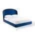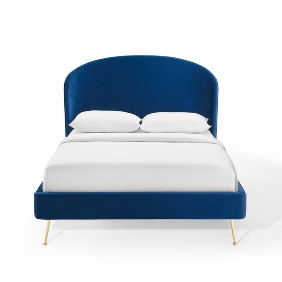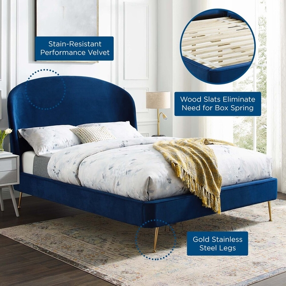 Embracing curves define the Mira Queen Performance Velvet Upholstered Platform Bed. An expansive sloping headboard on Mira will claim center stage in your bedroom decor with a glam deco style that radiates a bold new look. The Mira Queen Bed has dense foam padding that is covered in luxurious, stain-resistant performance velvet polyester upholstery for resting, reclining, reading, or conversing in bed. Four brushed gold stainless steel splayed legs with ball feet and non-marking foot caps support this queen bed solidly constructed from pine and plywood. Eliminating the need for a box spring, this platform bed frame is a sturdy mattress foundation for memory foam, innerspring, latex, and hybrid mattresses. Welcome the striking Mira Queen Bed into your master suite or guest bedroom for a decor transformation. Weight Capacity: 1323 lbs.