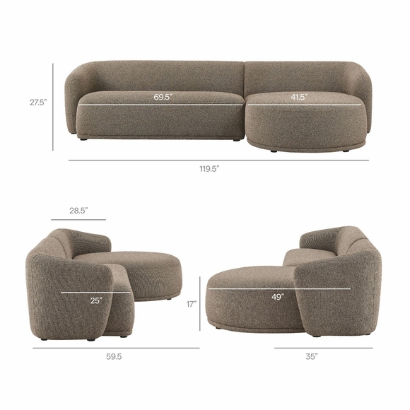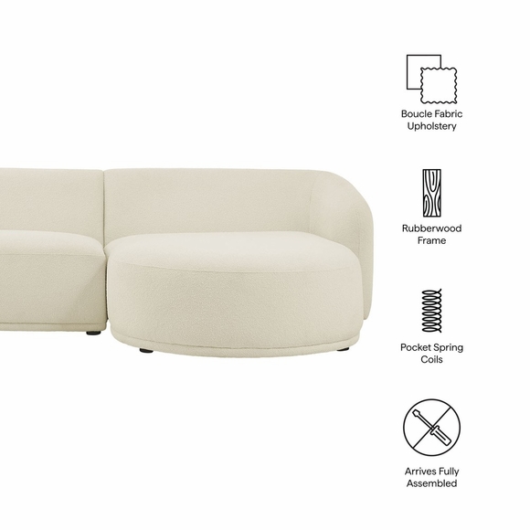 Settle into the inviting curves of the Monica Boucle Sectional, a two-piece couch that brings a clean, cohesive look to anchor any room. Wrapped in soft boucle fabric, this right-arm design pairs a chaise with a one-arm loveseat to form a right facing sectional with a low, rounded silhouette that fits neatly in modern spaces. Built on an internal wood frame with a supportive spring pocket coil system, it seats 3-4 comfortably and arrives fully assembled. Loveseat Weight Capacity: 600lbs; Chaise Weight Capacity: 300 lbs.