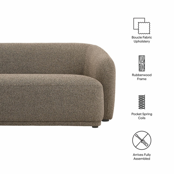 Settle into the inviting curves of the Monica Boucle Sofa, an 88 Inch Boucle Sofa that brings a clean, cohesive look to anchor the room. Wrapped in soft boucle fabric, this modern upholstered cloud couch has a low, rounded silhouette that fits neatly in modern spaces. Built on an internal wood frame with a supportive spring pocket coil system, it seats 3-4 comfortably and arrives fully assembled. Weight Capacity: 600lbs
