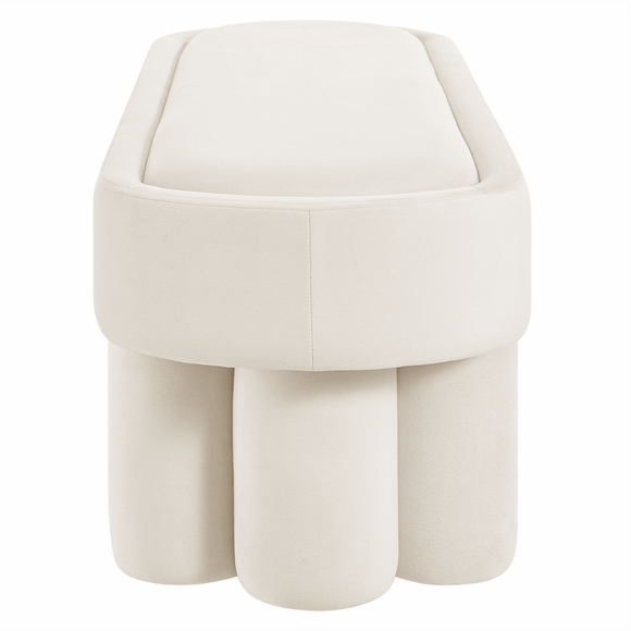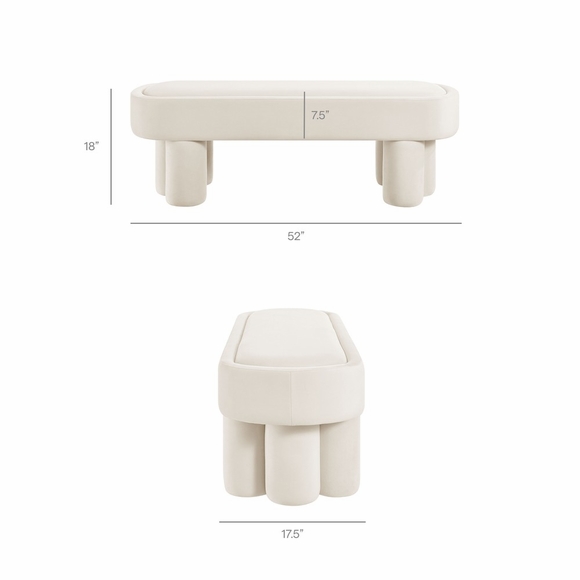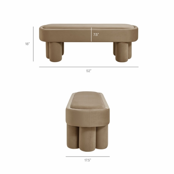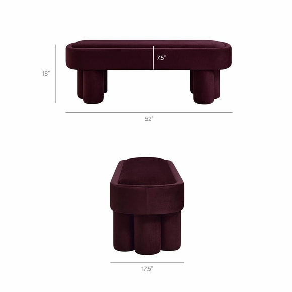 Soft curves and bold geometry define the Mossi Performance Velvet Bench, a modern accent piece with sculptural appeal. Upholstered in stain-resistant performance velvet, this 52-inch oval bench offers a smooth, tailored look with an inset seat cushion for added comfort and refinement. Resting on cylindrical legs resembling a clover-like base, Mossi makes a striking design statement while providing sturdy support. Whether styled at the end of a bed, in an entryway, or as a lounge bench in the living room, this upholstered velvet bench combines practicality with contemporary artistry. Weight Capacity: 300 lbs.
