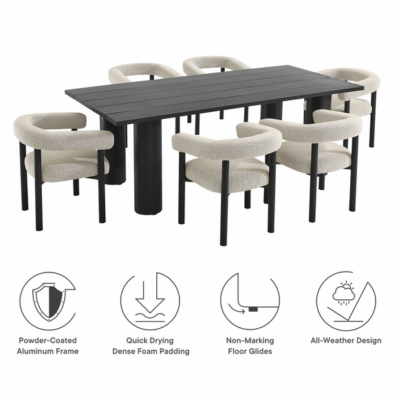 Elevate your outdoor space with the Nautica Modern Contemporary 7-Piece Outdoor Dining Set. This patio furniture dining set includes an 87" rectangular aluminum dining table and six curved-back patio armchairs, combining durability with sleek design. Crafted from powder-coated metal, the aluminum outdoor dining chairs and table offer a perfect blend of aesthetic appeal and functionality. The curved back and sleek tubular frames of the chairs provide a comfortable seating experience, while the slatted tabletop and tubular legs of the table ensure stability and style. Designed for all weather conditions, the dining chairs feature quick-drying dense foam padding and water-resistant fabric upholstery. The non-marking plastic foot glides protect your flooring, making this aluminum outdoor dining set ideal for any surface. Designed as a versatile patio table set, the Nautica 7-Piece Aluminum Outdoor Dining Set with Round Back Patio Armchairs is your go-to choice for exceptional outdoor dining. Enhance your backyard, porch, or garden with this aluminum patio furniture collection, and enjoy comfort and style all year round. Assembly required.